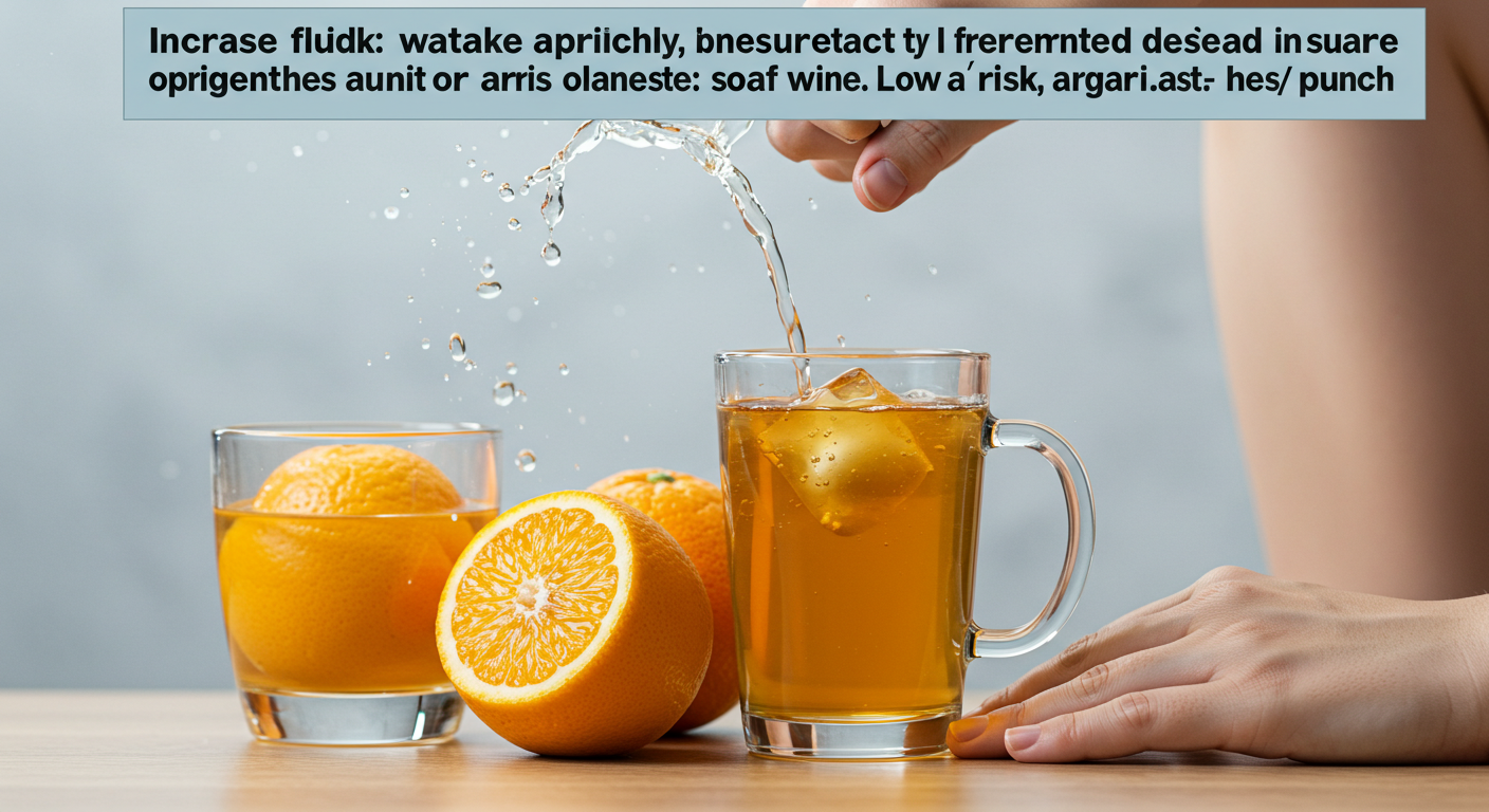 - 수분 섭취: 충분한 소변량을 확보하기 위해 물을 중심으로 수분 섭취를 늘린다. 커피, 맥주, 와인, 오렌지 주스는 낮은 위험과 관련이 있고, 설탕 첨가 탄산음료/펀치는 높은 위험과 관련이 있다는 보고가 있다.