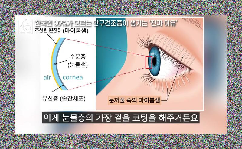 많은 분들이 안구 건조증의 원인을 단순히 눈물 부족이라고 생각하기 쉽습니다. 하지만 영상에서는 놀라운 사실을 알려줍니다. 실제로는 눈물 양 자체가 부족한 경우보다, 눈물의 '질'에 문제가 있는 경우가 훨씬 많다는 것이죠. 우리 눈꺼풀 속에는 ' 마이봄샘 '이라는 기름샘이 존재하는데, 여기서 분비되는 건강한 기름이 눈물층 가장 바깥 부분을 코팅하여 눈물이 빠르게 증발하는 것을 막아줍니다. 하지만 이 마이봄샘에 염증이 생기면 기름의 질이 나빠지거나 분비 자체가 원활하지 않게 되고, 결국 눈물이 제 역할을 하지 못해 안구 건조증 증상이 나타나는 것입니다. 즉, 눈물이 충분해도 기름 코팅이 부실하면 눈은 건조해질 수밖에 없는 거죠.