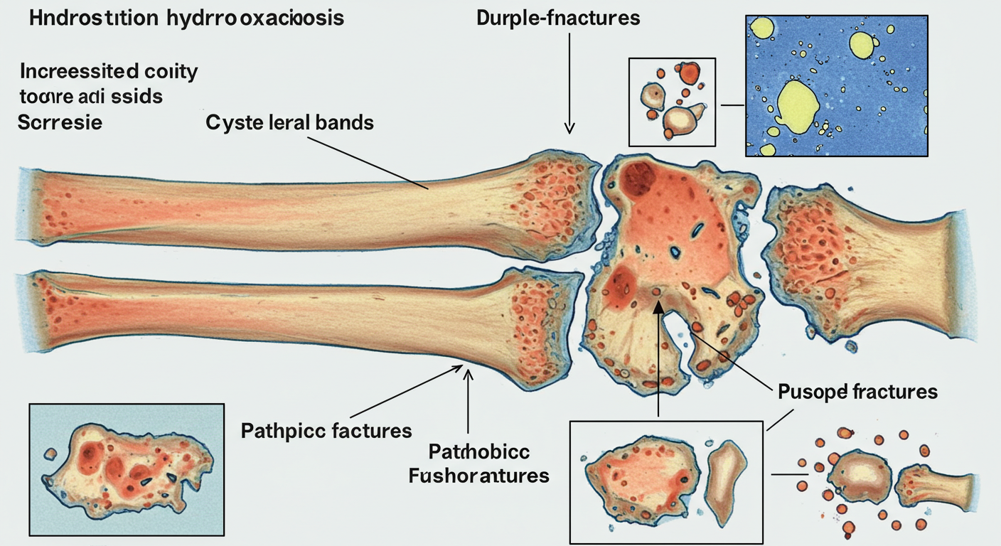 뼈에 옥살산이 침착되는 것은 수산증의 특징 중 하나이다. 이는 골밀도 증가(경화), 낭성 병변, 조밀한 골간단대(dense metaphyseal bands), 병적 골절, 가성 골절 등으로 나타날 수 있다.