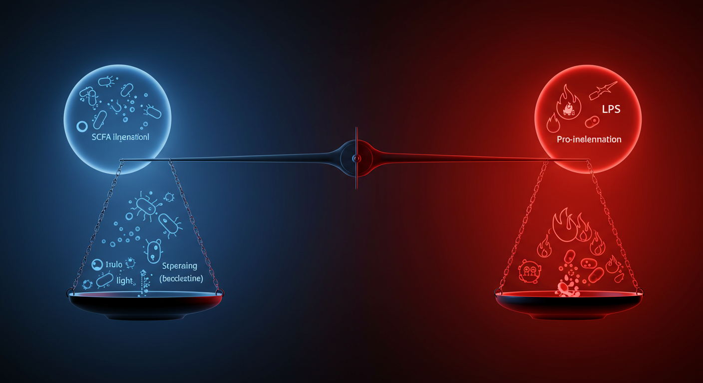 - 염증 유발 가능성: 미생물 불균형(dysbiosis)은 염증 유발균(예: 일부 프로테오박테리아, 병원성 공생균)의 증식을 초래할 수 있다. 또한, 장 투과성 증가는 LPS와 같은 세균 구성 성분의 혈류 유입을 증가시켜 TLR(Toll-like receptor) 활성화를 통해 전신적인 만성 저등급 염증(systemic low-grade inflammation)을 유발한다. 이러한 만성 염증은 여러 만성 질환의 핵심적인 병리 기전으로 작용한다.