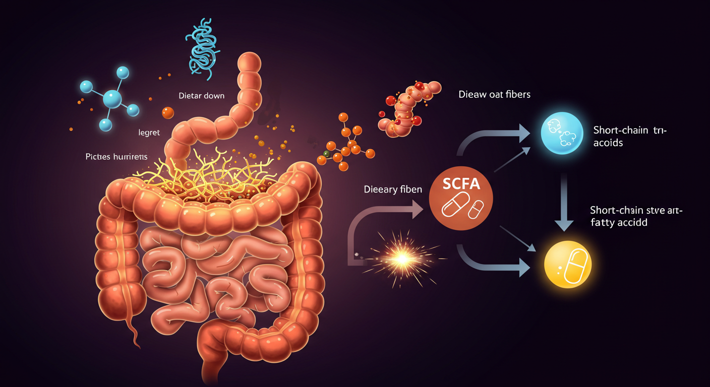 - 식이섬유 분해: 인간의 소화 효소로는 분해할 수 없는 복합 탄수화물(식이섬유, 저항성 전분, 다당류 등)을 장내 미생물이 가진 다양한 효소(예: 가수분해효소)를 이용해 분해한다. 이 과정은 주로 대장에서 일어난다.